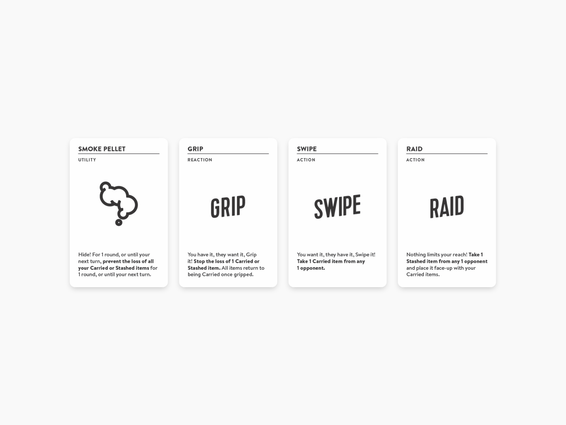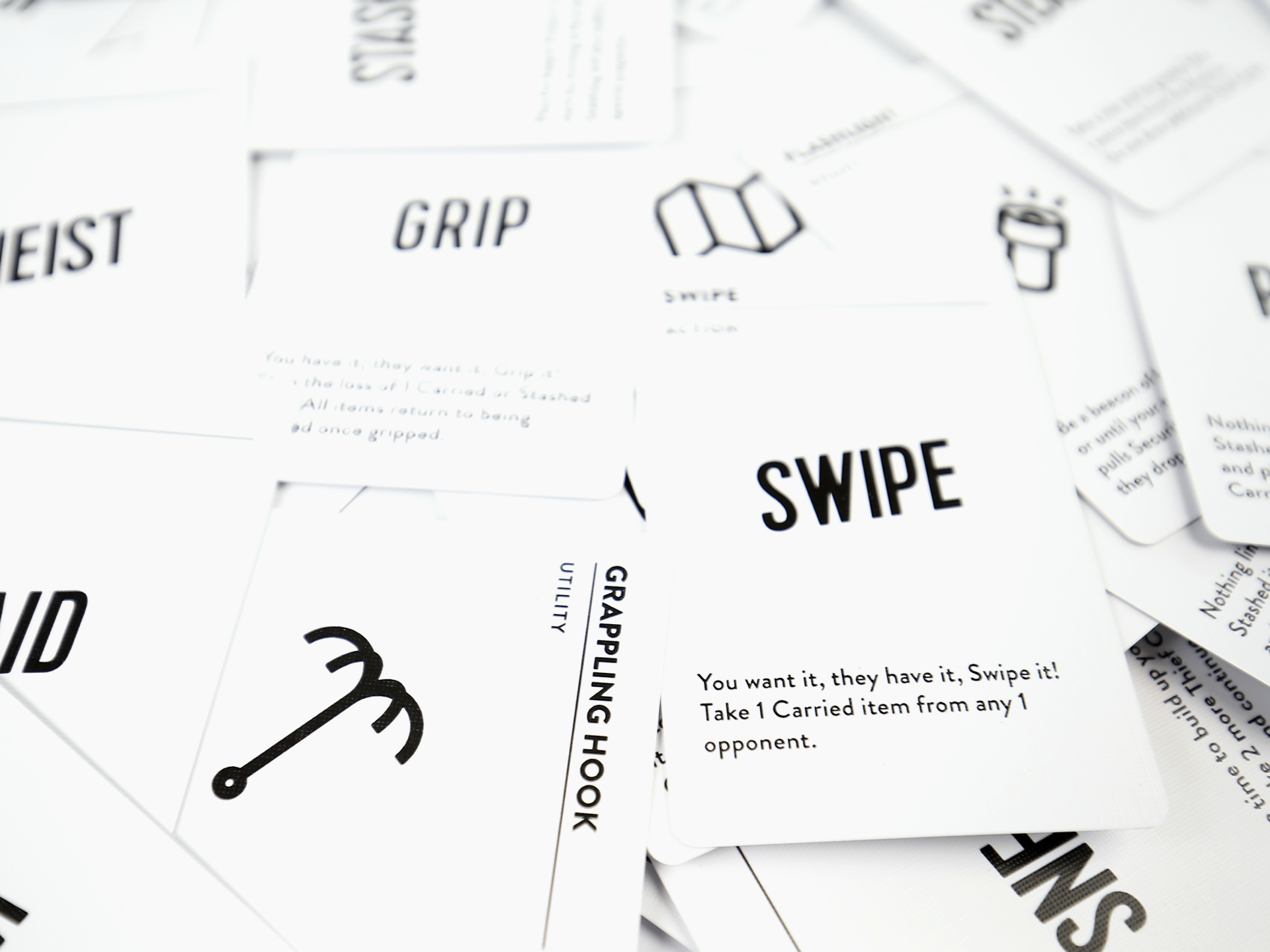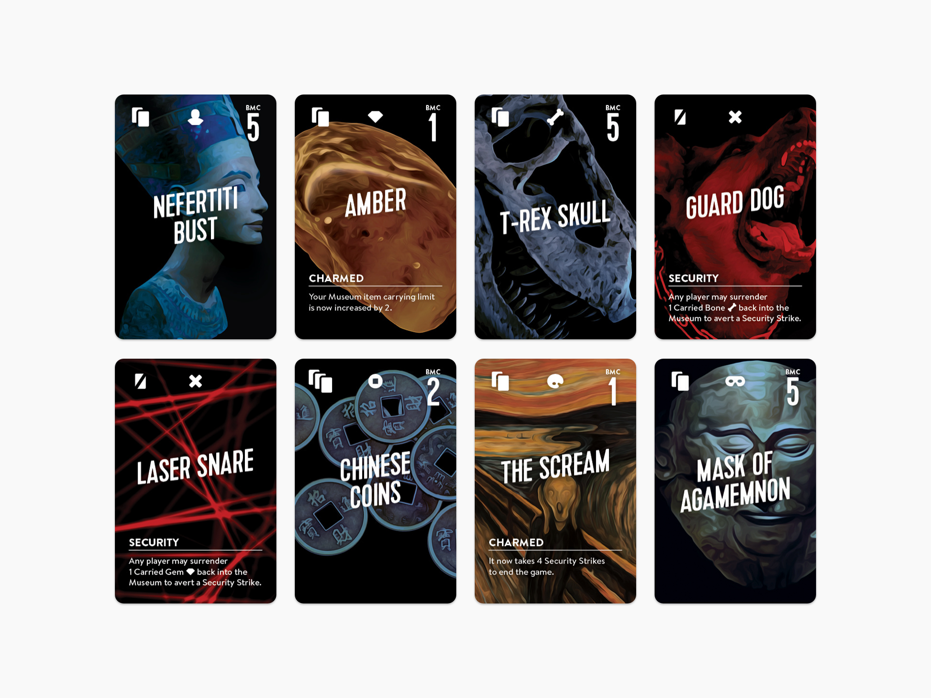 In designing Master Thief, we aimed for a visual language that is clever, engaging, and clear. Iconography was essential to ensure intuitive gameplay, while a predominantly black-and-white color scheme, punctuated by selective use of color, created emphasis and intrigue. Certain cards featured holographic elements to further highlight their significance within the game.